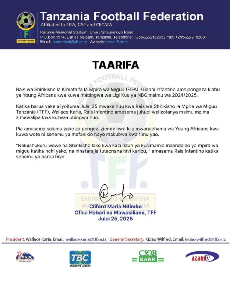 Rais wa Shirikisho la Kimataifa la Mpira wa Miguu (FIFA), Gianni Infantino, ameipongeza rasmi Klabu ya Yanga kwa mafanikio yake makubwa ya kutwaa ubingwa wa Ligi Kuu ya NBC msimu wa 2024/25.